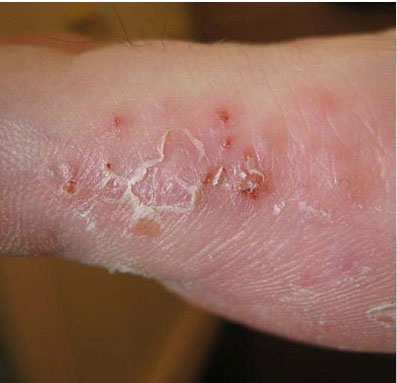 足癣(俗名“香港脚”、脚气),系真菌感染引起,其皮肤损害往往是先单侧(即单脚)发生,数周或数月后才感染到对侧。足癣的皮肤损害有一特点,即边界清楚,可逐渐向外扩展。因病情发展或搔抓,可出现糜烂、渗液,甚或细菌感染,出现脓疱等。
