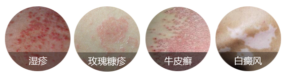 白斑、皮肤癣、疤痕,脱发、真菌性皮肤病、皮炎、湿疹、痤疮、荨麻疹、带状疱疹等疾病。